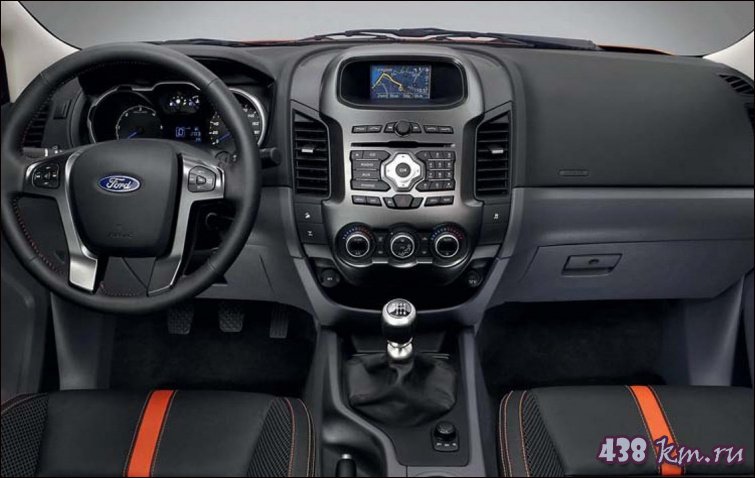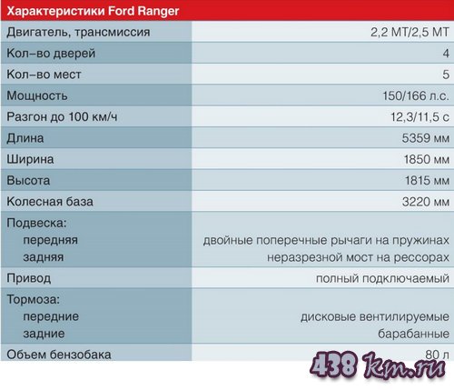 В плане динамики Ranger с таким мотором даст фору многим легковушкам. Коробок передач три: 5-ступенчатая механика и два 6-ступенчатых агрегата — МКПП и АКПП. Интересно, что 5-скоростная коробка агрегатируется лишь с бензиновой версией, 6-ступенчатые трансмиссии положены только дизелям. Понятно, зачем это сделано, — у моторов на тяжелом топливе уже рабочий диапазон. Система полного привода у Ranger принципиально не изменилась. На асфальте можно применять лишь задний привод, а вот на скользких покрытиях или в грязи рекомендуется использовать все четыре колеса. Подключается передняя ось жестко, с помощью электроники. Раздаточная коробка у машины 2-ступенчатая, имеется понижающая передача с демультипликатором 2,48:1, так что по проходимости пикап не уступит почти никому. Свесы умеренны, а глубина преодолеваемого брода составляет 800(!) мм, и это без специальной подготовки. Единственное, чего не хватает машине, — механических блокировок, собственно, уже в базе есть ESP, которая позаботится об имитации блокировок, если это действительно понадобится, однако механика работает при диагональном вывешивании несколько эффективнее.