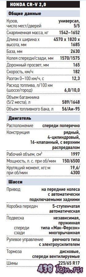 На этом фоне остальные новшества - сущие мелочи. Спидометр одолел-таки тахометр, став заметно крупнее. Что еще? Вместо графических «гребенок», докладывающих о температуре двигателя и уровне топлива, появились привычные «стрелочники». А еще в салоне поселились три крупных дисплея, распределяющих между собой различную информацию и функции - от показаний бортового компьютера и настроек климат-контроля до навигации и телефона. Но самое главное, что украшательства никоим образом не сказались на главной добродетели внутреннего мира CR-V: эргономика осталась образцовой!