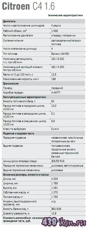 В последнее время концерн PSA, куда входит и Citroen, предпочитает сотрудничать с BMW в области создания и доводки двигателей. С4 не исключениє — его 120-сильный четырехцилиндровый атмосферних объемом 1,6 литра также является плодом кооперации с баварским автогигантом. К сожалению, выделенный нам тестовый автомобиль еще не прошел должную обкатку в 5 тысяч км и всех своих талантов продемонстрировать не смог. Однако даже необ-катанный двигатель порадовал хорошей тягой на низах и уверенным разгоном на высших передачах. Выручив минутку свободного пространства за городом, мы разогнали С4 до 130 км/ч — машина идет по трассе как влитая и прекрасно придерживается установленного курса.