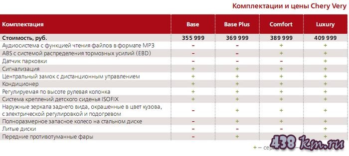 Что касается доступных для покупки вариантов автомобиля, то сегодня он представлен в четырех комплектациях — Base, Base plus, Comfort, Luxury. В перечне базового оборудования значатся кондиционер, аудиосистема, стеклоподъемники, гидроусилитель руля, а если доплатить 34 ООО рублей за версию Comfort, то в автомобиле появятся CD-плеер с 4 динамиками, ABS, электропривод и подогрев наружных зеркал, электрические задние стеклоподъемники.