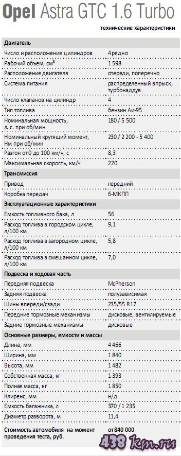 Заметно улучшилась обзорность, и существенно расширился список оборудования, как штатного, так и опционного. В нем числятся фирменная сигнализация, CD-магнитола с семью динамиками и встроенным усилителем мощностью 4 х 20 Вт или акустическая система Infinity Sound System, в когорую входит семи-канальный усилитель мощности (7 х 45 Вт) и процессор цифровой обрабогки сигналов, продвинутая навигационная система с голосовым управлением и синхронизацией с телефоном, активный круиз-контроль, измеряющий расстояние до впереди идущего автомобиля не в метрах, а в секундах. Ну и, конечно же, новое поколение камеры OpclEye, которая не только сама управляет внешними световыми приборами в зависимости or внешних условий, но еще следит за разметкой и читает дорожные знаки. Кстати, Opel уверяет, что «чудо-глаз» будет понимать и российские дорожные знаки, сделанные и установленные по ГОСТу. И смею вас уверить, в случае с Opel Asta GTC это не бесполезная игрушка, хотя бы потому, что за рулем такой горячей штучки легко забыть, например, про ограничения скорости. Автомобиль обладает великолепными динамическими характеристиками причем, это выражается не только в максимальной скорости за 200 км/ч и разгоне до «сотни» за 8,3 секунд, но прежде всего в отточенной управляемости. Ну да расскажу все но порядку.