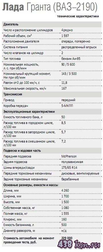 Технические характеристики GRANTA не являются сюрпризом для покупателей: машина получила уже хорошо знакомый вазовский двигатель объемом 1,6 литра, мощностью 82, 89 либо 98 л.с. (в зависимости от числа клапанов — 8 или 16); механическую КПП с пятью ступенями (поначалу она будет позаимствована у ВАЗ-2110, позже появится модернизированный вариант с улучшенной избирательностью переключений, а еще немного позже — долгожданный автомат) и доработанную приоровскую подвеску. Пока существуют две фиксированных версии LADA GRANTA: наиболее дешевый «Стандарт» за 229 тысяч рублей и «Норма» за 256 тысяч рублей. Отличие более дорогой версии, помимо прочего, заключается в более интересных настройках рулевого управления (3 оборота против 3,8 у «Калины» и версии «Стандарт»), наличием кондиционера, ABS с функцией Brake Assist и подушки безопасности переднего пассажира, аудиосистемы и навигации.