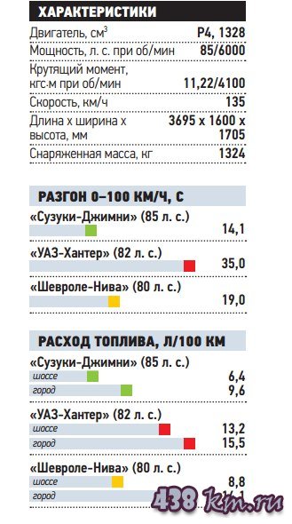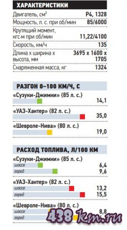 Внимательный читатель обратит внимание на посвежевший экстерьер малыша: рука дизайнера коснулась переднего бампера, потрогала решетку радиатора и зацепила капот, надрезав на нем воздухозаборник. Вероятно, через него в двигатель забежали еще три «лошади»: теперь под капотом бьют копытом 85 «скакунов». Впрочем, три силы - не в коня корм: «Джим» как был тихоходом, так им и остался. В городе динамики автомобильчику еще хватает, но на трассе уже ощущается недостаток мощности. Да и «автомат», как водится, берет свою мзду: ворочать гидротрансформатором 1,3-литровому моторчику непросто. Зато к тормозам - никаких претензий, благо работы для них не так уж много: в «Сузуки» всего 1075 кг снаряженной массы.