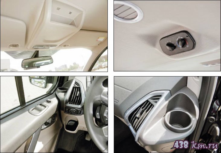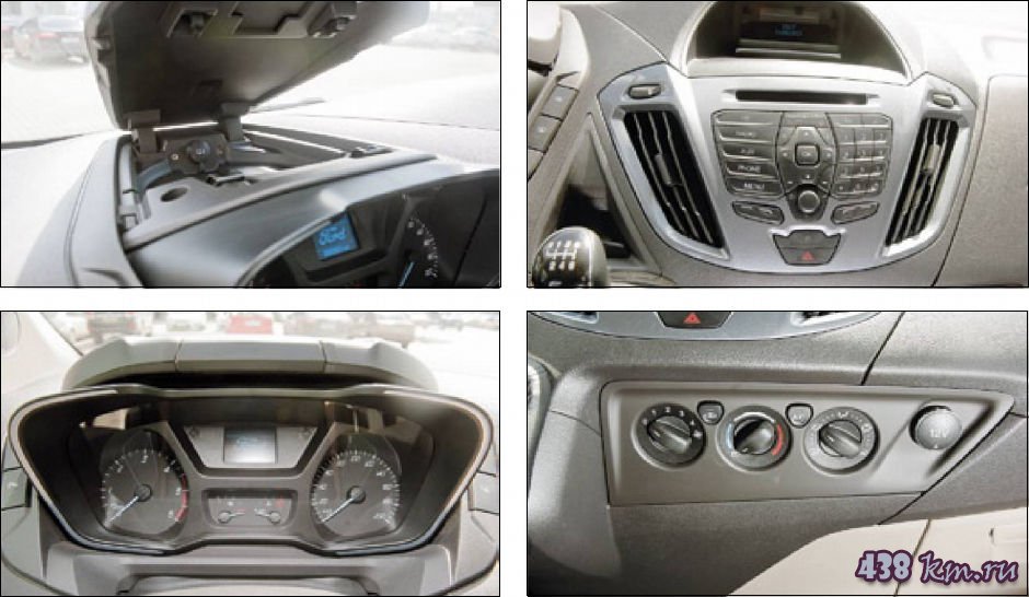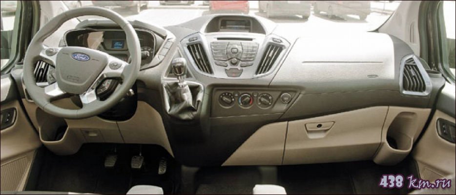 По дизайну интерьер Tourneo Custom скорее легковой, нежели автобусный, что сразу поднимает настроение. Передняя панель выполнена в новом «космическом» стиле Ford: эффектная «глубокая» комбинация приборов с цветным дисплеем посредине, большой цветной мультимедийный экран в центре торпедо, легковой руль от Focus с кнопками, регулирующийся в широких пределах, камера заднего вида (изображение выводится на зеркало заднего вида), навигационная система. Над щитком приборов расположен отсек, который удобно использовать для документов или мобильника, поскольку внутри есть розетка 12 V. Также розетки есть на передней панели и в багажнике.