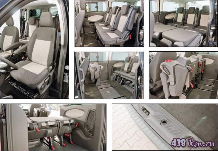 Изучая возможности трансформации раздельных кресел второго и третьего ряда — спинки каждого из них регулируются но углу наклона независимо друг от друга, а также ремешки и рычажки, с помощью которых все и происходит,— отмечаем следующее: во-первых, чтобы попасть на «галерку», достаточно поднять всего одно сидение второго ряда. Но при этом проход таков, что приходится через это самое кресло переступать. Во-вторых, нельзя трансформировать салон так, чтобы сидеть друг напротив друга. В-третьих, ровной площадки из сидений, на которой можно отдохнуть во время дальней поездки, Tourneo Custom также не предлагает.