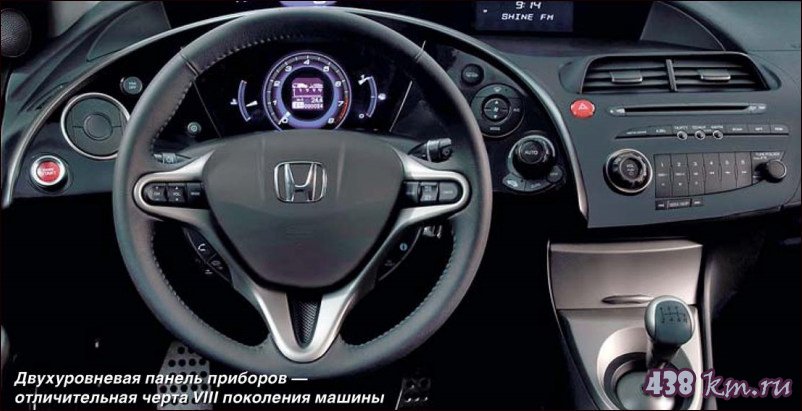Салон Civic гармонирует с внешним видом — в хетчбэке поэкзотичнее, в седане посолиднее, однако общие элементы все равно встречаются, например передняя панель, состоящая из двух частей, и цифровой спидометр прямо над аналоговым тахометром. Сзади особо не разгуляешься, но тесноты как таковой тоже нет — все в пределах нормы и класса. Type R доукомплектован спортивными сиденьями с развитой боковой поддержкой и алюминиевыми элементами декора. Багажник не безразмерный, но и не маленький — скорее твердый середнячок. Под полом багажника полноразмерное запасное колесо с набором аксессуаров для его установки.