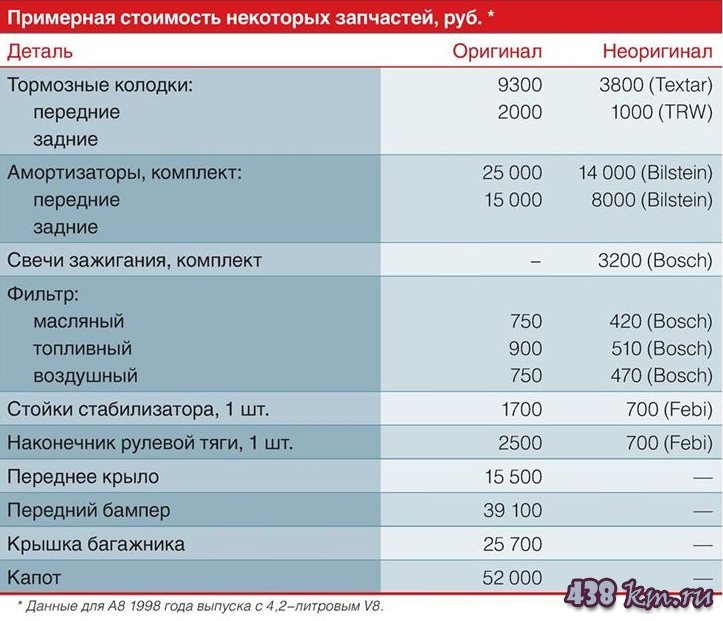 Большие двигатели делают содержание А8 довольно дорогим: масла моторам надо много, как и свечей зажигания (вот вам и лишние затраты). Плановое обслуживание рекомендуется проводить каждые 10тыс. км (положено менять масло, топливные и воздушный фильтры выдерживают в два раза дольше). Но могут возникнуть и внеплановые траты, в частности дизельные двигатели у А8 требовательны к топливу, плохое горючее легко выводит из строя топливную аппаратуру. Для 3,3-литрового мотора тяжело найти запчасти: этот двигатель у нас никогда не был популярен. Что касается бензиновых силовых агрегатов, то они достаточно надежны. При этом надо отдавать себе отчет в том, что пробег у львиной доли машин большой, двигатели не новые, к тому же многие наверняка ремонтировались, так что к выбору экземпляра следует подходить серьезно.