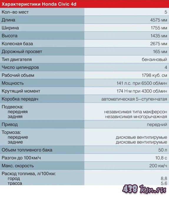 Еще больше остроты можно получить, меняя передачи вручную подрулевыми лепестками. Кстати, расчетные 174 Н м достигаются при 4300 об/мин, как и положено «крутильному» хондовскому движку. Вместе с тем седан способен и на миролюбивое поведение, для этого нажимаем зеленую кнопочку Есоп, и Civic превращается в образец экономичности, выбирая повышенные передачи раньше и с запасом. При ежедневной экоэксплуатации даже в пробочные часы пик средний расход бензина не превышал 9,2 л/100 км/ч, что можно считать очень хорошим результатом. Правда, экономичность плохо сочетается с динамикой, и срабатывания кик-дауна (например, при попытке активного перестроения в соседний ряд) приходится ждать целую вечность. Поэтому мы голосуем за смешанный режим движения: при размеренной езде по трассе и свободным улицам включаем Есоп, а там, где требуется проявить активность, переводим седан в стандартное состояние.