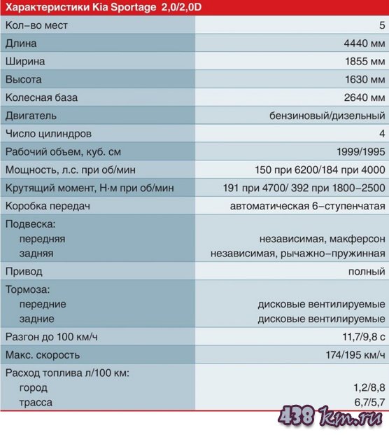![]() Kia Sportage в России самый популярный кроссовер — после пяти лет успешного продвижения по рынку подвергли обновлению. Если внешне машина почти не изменилась, то с характером случились некоторые метаморфозы. В этом году Kia Sportage исполняется 20 лет Дебютировав в 1994 г., кроссовер сменил уже три поколения. Нынешний автомобиль, дизайн которого нарисовал Питер Шрайер, увидел свет в 2009 г. В канун юбилея Sportage примерил несколько обновок. Основные усилия конструкторов были направлены на корректировку дизайна, улучшение качества отделки и наполнение новыми опциями. У нас эта машина пользуется поистине народной любовью — за четыре года в России продали около 100 тыс. штук, а в прошлом году на нем остановили свой выбор более 33 тыс. покупателей. Спрос спросом, но не будем забывать, что машина все это время выпускается практически без изменений. Теперь конструкторы постарались учесть все пожелания клиентов и исправить нарекания нынешних владельцев, которых, положа руку на сердце, было не так уж много. Но обо всем по порядку. Внешние обновления можно пересчитать по пальцам. Прежде всего отмечаем решетку радиатора с ячеистой структурой, красивые колесные диски — теперь можно выбирать как 16- и 17-, так и 18-дюймовые колеса. В духе тенденций — светодиодные задние фонари, и небольшой штрих — антенна в виде плавника вместо стандартной штыревой. Кроме того, в палитре — новые цвета кузова. Теперь заглянем в салон. Сразу заметны более качественные материалы отделки передней панели и панелей дверей, а также специальная окраска Soft Touch. Щиток приборов легко читается, а экран Supervision с цветным 4,2-дюймовым TFT-дисплеем стал ярче и информативнее. Забираться внутрь стало удобнее за счетопущенных чуть ниже порогов. К сиденьям претензий нет, они имеют удобную форму и позволяют найти комфортное положение за рулем. Наконец появился электропривод регулировки водительского кресла, однако само кресло стоит слишком высоко, и рослым водителям за рулем тесновато. К мультимедийной системе Infiniti претензий нет — шесть динамиков с сабвуфером исправно выполняют свою работу. Управление возложено на цветной сенсорный дисплей, на который также выводится картинка с камеры заднего вида. Навигация работает споро и прокладывает маршрут оптимально и без промедлений. Стоит отметить и отличную шумоизоляцию — это заслуга нового лобового стекла, между слоями которого проложен специальный слой пленки для снижения шума от набегающего потока воздуха. Кроме того, есть пара технических моментов: в трансмиссии появился дополнительный промежуточный вал, а панели задней части пола стали толще, что позволило снизить уровень вибраций. Как и прежде, Kia Sportage предлагается в России с тремя вариантами двигателей, все объемом 2 л: бензиновым (150л.с.) и двумя дизельными (136 и 184л.с.), а также передним или полным приводом. Нам довелось протестировать бензиновую версию с автоматом. Этот мотор нетороплив. К тому же педаль газа излишне задемпфирована, что приводит к растянутым реакциям на нажатие. Динамика откровенно слаба и позволяет лишь поддерживать темп движения, о резких ускорениях с хода остается только мечтать. Частичное решение проблемы — ручное переключение передач подрулевыми лепестками, позволяющее взбодрить машину для обгона. Самый мощный агрегат в линейке — 184-сильный дизель — мощнее как на б