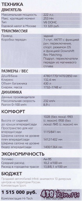 Прибавить ко всему умеренный расход топлива(примерно 12 л/100 км при езде по Москве и ближайшим пригородам) -и картина становится еще привлекательнее. Есть и еще одна хитрость, на вопрос о которой представители Infniti не стали кривить душой. Можно заказать G25 без шильдика, и мало кто догадается, что это не «старший» из седанов. Кое-кто уже старается сделать именно так. И экономия есть, и престижность не страдает.