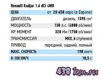 С последним из названных Kadjar делит 60% компонентов. Среди сильных сторон новинки помимо стремительного и мускулистого кузова аккуратный интерьер с 7-дюймовым экраном, хороший запас пространства для пассажиров и один из самых вместительных багажников в классе. Естественно, доступен полный привод, но такую модификацию Kadjar не будут предлагать ни с экономичным бензиновым турбомотором 1.2 ТСе, приятным и достаточно комфортным даже в дальних поездках, ни с турбодизелем 1.5 dCi, который, по прогнозам, станет в Европе самым востребованным. Этот дизель -единственный, который будет сочетаться с коробкой EDC с двумя сцеплениями. Кому 20-сантиметрового клиренса и привода на одну ось недостаточно, получат модификацию с мотором 1.6 dCi, на которой мы и прокатились.