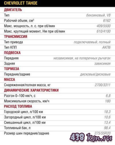 Традиционный бензиновый восьмицилиндровый Ѵ-образный «атмосферник» объемом 6,2 литра развивает 409 л. с., крутящий момент 610 Нм. Слава американским традициям: сегодня больше нигде не найдешь таких прекрасных в своей консервативности моторов. Chevrolet Tahoe разгоняется до сотни километров в час всего на несколько десятых секунды дольше, чем, например, микроскопическая «жуж-жалка» VW Golf GTI, правда, это не наделяет Tahoe спортивным характером. При нажатии педали газа в пол шестиступенчатый «автомат» сначала немного задумывается, затем переходит на передачу ниже, и с приглушенным ревом «Тахо» начинает ускоряться так быстро, что сразу вспоминаешь о заокеанской привычке экономить на тормозах.