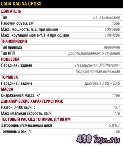 И я с ними согласен! Требовать от дорогого «паркетника" преодоления серьезного бездорожья наравне со «взрослыми» внедорожниками -абсурд. А в таком случае, если не гнаться за известным комфортом, зачем переплачивать? Конечно, одним лишь клиренсом дело не ограничилось - в дополнение к лифту, которого достигли благодаря более длинным (на 20 мм) стойкам подвески в сочетании с большим диаметром колеса ( 15") и пластиковым молдингам, Lada Kalina Cross получила новые значения главной пары и, как следствие, более короткие первые ступени КПП. Притом касается это только пятиступенчатых МКПП -в них передаточное число увеличилось с 3.7 до 3.9, тогда как в комплектации с автоматической (роботизированной) КПП значение, наоборот, «упало» с 4.1 до 3.7. Логике, конечно, такая рокировка не поддается, и разъяснить ее мне не смогли даже специалисты нескольких дилерских центров Lada. 8 остальном все изменения носят исключительно косметический характер и на повадки автомобиля не влияют.