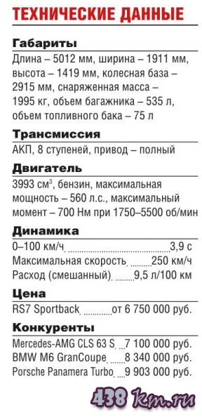 «Сотню» RS7 набирает всего за 3,9 с, максимальная скорость с отключенным ограничителем (опция) — немалые 305 км/ч! Надо ли говорить, что этот автомобиль любит прямики и ходовые повороты? Отрадно,что, несмотря на серьезные габариты и массу, RS7 прекрасен даже в сложных связках поворотов! Так что на треке эту модель Audi обставит далеко не каждый суперкар. И ни один — за воротами автодрома, в обычной жизни...