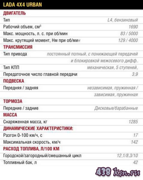 А больше и не надо. Это как раз то расстояние, которое LADA 4x4 Urban, оснащенная двигателем объемом 1690 см3 и постоянным полным приводом с не самой технологически совершенной (и вдобавок «музыкальной») трансмиссией, может преодолеть без дозаправки. Конечно, в данном случае речь идет о смешанном цикле, включая и «пробки», и трассу, и бездорожье на понижающей передаче с блокировкой межосевого дифференциала. Реальный расход превышает заявленный (10л/ 100 км в смешанном цикле) примерно на 3 - 3,5 литра. Но это пока все узлы не притрутся (наверное, прочитав это предложение, у каждого третьего должен вспыхнуть огонек ностальгии)... Лучший способ ускорить процесс «притирки» я услышал от одного армянина: машина вывешивается, крепление агрегатов ослабляется, чтобы появился небольшой люфт, после чего (цитата) «заводится двигатель, втыкается третья, и тапок в пол»! Как только все встает на место, весь отпущенный крепеж затягивается, и - вуаля- мы получаем почти бесшумный автомобиль. К слову, за эту процедуру предприимчивые кавказские бизнесмены берут очень неплохие деньги.