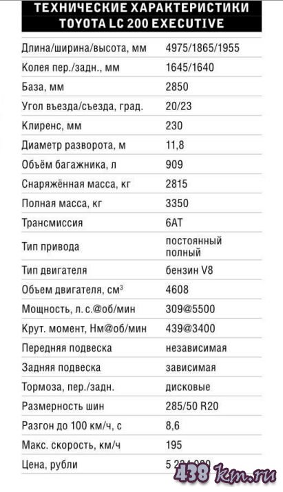 Toyota LC 200 - классический внедорожник. В основе своей имеет раму. Передняя подвеска независимая. Задняя - неразрезной мост. Машина на тесте включает гидропневматические элементы с возможностью регулировки кузова по высоте плюс адаптивную систему изменения жёсткости подвески. Полный привод построен на центральном дифференциале Торсен. Раздаточная коробка с пониженной передачей. Коробка передач шестиступенчатая гидромеханическая. Мотор бензиновый с распределённым впрыском топлива, цепным приводом распредвалов и двойной электронной системой изменения фаз газораспределения Dual ѴѴТ-І. Руль с гидроусилителем. Тормозные диски вентилируемые.