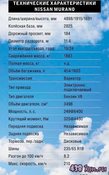 В итоге на фоне конкурентов Nissan Murano 2016 года выглядит вполне достойно и способен понравиться водителям, которые больше ценят расслабленный, сибаритский стиль, нежели уличные гонки. Таким же образом настроен трёхсполовинной литровый бензиновый мотор и вариатор. Все агрегаты ведут себя исключительно интеллигентно. Не досаждают рывками, шумом и резкими переключениями. Как всегда, у больших Nissan радует муфта подключения полного привода. Она сделана исключительно грамотно и долго сопротивляется перегреву. Выезжая на бездорожье, беспокоиться нужно, скорее, о подвеске, поскольку конёк нового шасси - это комфорт. Поэтому съезжая на пересечённую местность, берегите переднюю подвеску. Быстрой езды по кочкам новый Murano вам не простит.