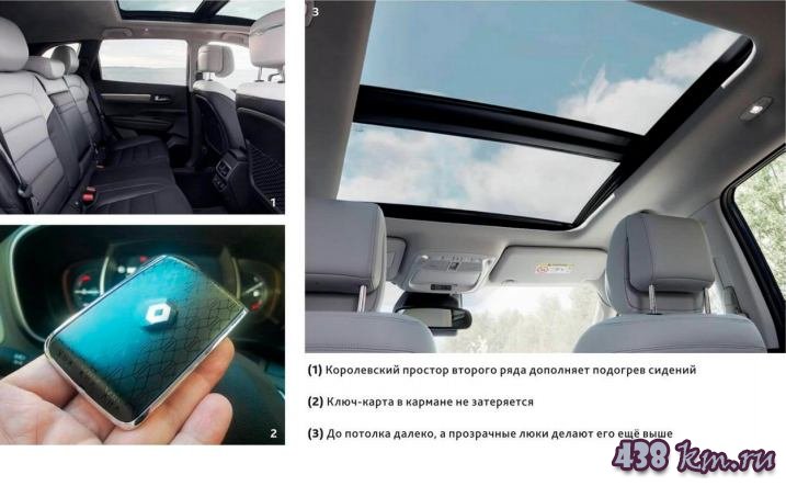 Имеющий одинаковую с Nissan X-Trail колёсную базу новый Koleos—полноценный класс D с просторным салоном и большим багажником, объём которого до верха спинок сидений—579 л, под крышу—831 л, а со сложенными спинками второго ряда — 1795 л. Пятую дверь снаружи можно открыть помахав ногой под бампером, в районе буксирного крюка, заодно прогнав заснувшую там кошку. Кстати, сам крюк раскладной—прячется и появляется при нажатии кнопки.