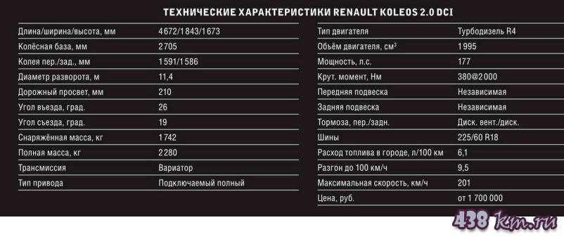 Renault Koleos на российском рынке существует в двух комплектациях—Executive и Premium. Первая попроще и полагается машинам с 2.0-литровым 144-сильным бензиновым мотором. Вторая может иметь под капотом 2.0-литровый 177-сильный дизель или 2.5-литровый бензиновый двигатель мощностью 171 л.с. При этом cреди интересных опций— панорамная крыша за 39 990 руб. и пакет «Безопасность» за 34 990 руб., в который входят автоматическое переключение света (ближний/дальний) и система контроля полосы. Пакет «Комфорт» включает автомат парковки, открывание багажника взмахом ноги под бампером, вентиляцию передних и подогрев задних сидений. Всё это за 64 990 руб. Ценовая отметка, с которой стартует двухлитровая бензиновая машина, —1 699 000 руб. Его более мощный бензиновый собрат— 2 009 000 руб, а дизель потянет уже на 2 169 000 руб. Много это или мало—сказать трудно. За один из самых вместительных кроссоверов в классе с учётом электроники и комфорта может быть и ничего. За продукт компании с традиционно демократичными ценами может и многовато. В любом случае, какие бы эмоции не вызывал новый Koleos, он безусловно вывел полноприводный флагман Renault на новый уровень размерности и комфорта.