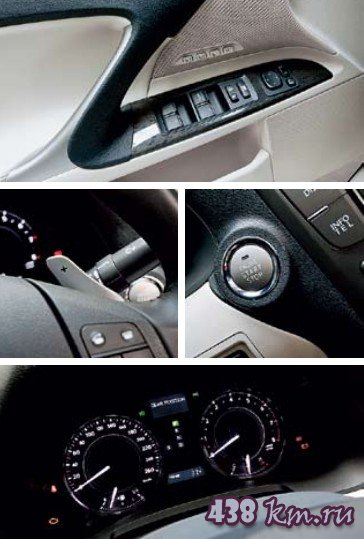 Для того чтобы попасть внутрь IS 250, не нужно прикасаться к ключу. Достаточно положить в карман радиометку — и машина сама определит момент, когда вы достаточно приблизитесь для отпирания дверей — приветливо зажжет подсветку асфальта рядом с дверью. Вам останется только потянуть на себя ручку, распахнуть потяжелевшую и выросшую на 30 см в длину дверь и погрузиться в объятия белоснежного салона из отличной кожи.