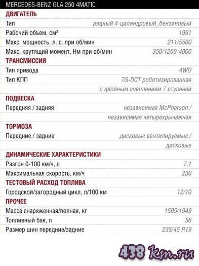 GLA доступен у нас в полноприводном варианте с двухлитровым бензиновым двигателем мощностью 211 л.с., а также с мотором объемом 1,6 л, мощностью 156 л.с. Есть 2,2-литро-вый 136-сильный дизель, но последние два варианта - переднеприводные. Можно упомянуть версию AMG, которая тоже полноприводная и мощная - 360 л.с., но это уже совсем другая история. В европейском варианте присутствует еще дизель (2,2 л, 170 л.с.), и все модели, за исключением 1,6-литровой, доступны с полным приводом. В трансмиссии присутствует семиступенчатая роботизированная коробка 7G-DCT. В Европе в сочетании с базовыми моторами доступна также шестиступенчатая «механика». У нас же, по-видимому, считается, что работа механической коробкой - дело для обладателя Mercedes малопристойное, поэтому машины предлагаются только с «роботом».