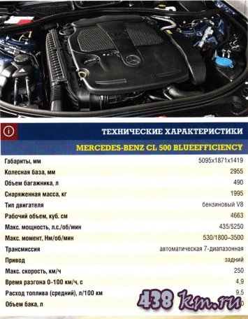Его рабочий объем в сравнении с предшественником уменьшился на 0,8 л и теперь составляет 4663 куб. см. Однако снижения мощности мотора не последовало - напротив, вместо прежних 388 л.с. новый агрегат выдает на 12% больше - 435 л.с. А рост величины крутящего момента оказался еще более внушительным: она возросла на треть - с 530 до 700 Нм. Благодаря этому разгон до "сотни" на CL 500 BlueEfficiency был сокращен на полсекунды и теперь составляет 4,9 с (заметим, у автомобиля, весящего 2 т). При этом мерседесовцы умудрились в заднеприводном купе снизить средний расход топлива почти на четверть, доведя его до "гроссмейстерских" 9,5 л на 100 км. Само собой, чище стал и выхлоп.