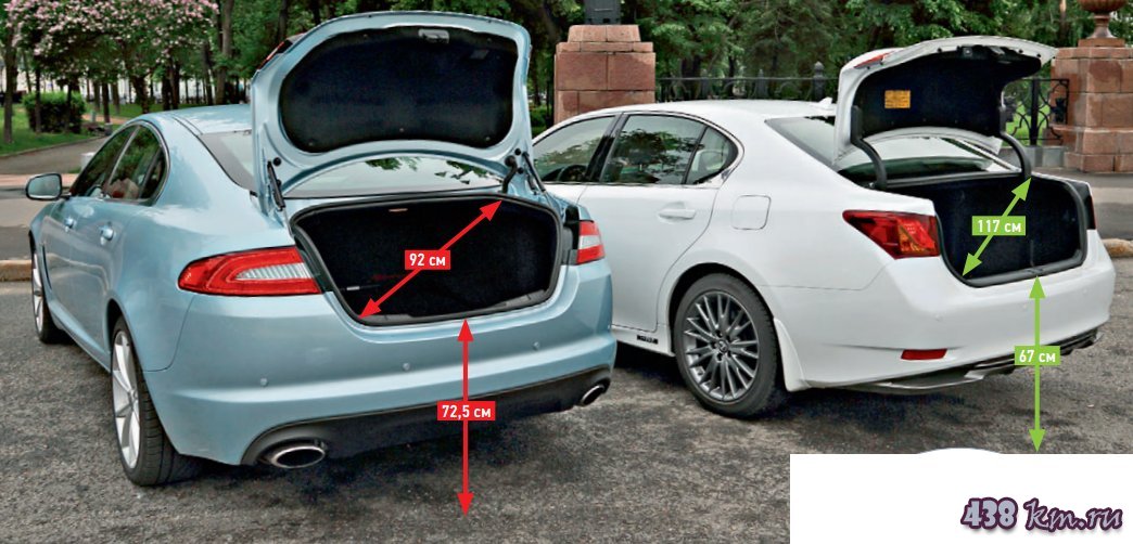 Конечно, представить себе владельца одного из наших дуэлянтов несущим коробки из «Икеи» довольно сложно, но не проверить удобство грузоперевозок мы тоже не имеем права. Электроприводом крышки багажника базовые версии похвастать не могут, но, в отличие от «Лексуса», «Ягуар» позволяет оснастить такой приятной «фичей» любую комплектацию. Заказать можно и складывающиеся задние сиденья: доплати «всего» 19 800 рублей - и спинки будут падать вперед по первому требованию. Только что толку? Проем багажника все равно останется узким, пол - неровным, а объем - на 30 литров меньше, чем у «Лексуса».