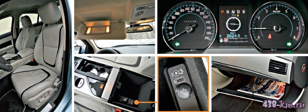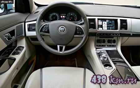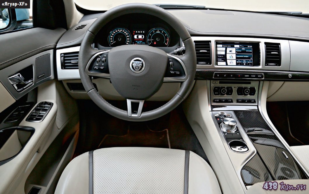 «Ягуар» - автомобиль-перформанс. После нажатия «дышащей» красным кнопки пуска интерьер оживает, как часы на здании Театра имени Образцова: открываются «жерла» дефлекторов, плавно вспыхивает экран и комбинация приборов, а из межкресельной консоли плавно выезжает шайба селектора «автомата». Завораживает.