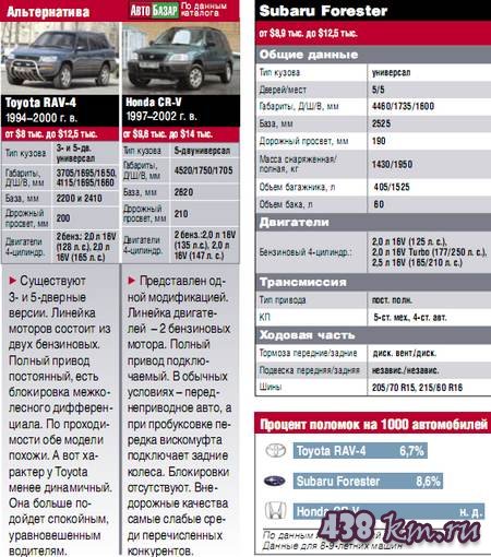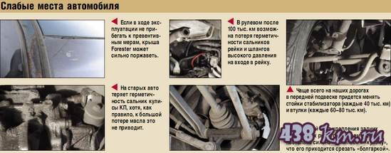 ![]() Постоянный полный привод, высокий клиренс, мощные двигатели, отличная устойчивость и управляемость - главные козыри универсала повышенной проходимости. В этом определении модели и кроется ее суть. Ошибочно считать Forester внедорожником - его стихия скоростные дороги, крутые виражи и покорение препятствий, неподвластных обычным легковым авто. Берегите крышу! ![]() Кузова Forester отличаются неплохой коррозионной стойкостью, но слабое место у них все же есть - это крыша. К ней нужно относиться очень бережно. В процессе эксплуатации специалисты советуют обязательно обрабатывать защитными полировочными составами мес та ее стыков с уплотнителем лобового стекла и рейлингами, а также подкрашивать сколы лакокрасочного покрытия после ударов камешками. Дело в том, что металл крыши, в отличие от остального кузова, не фосфатирован и больше всего подвержен «рыжей» болезни. Многие владельцы жалуются на слабый свет передней оптики - со временем ее защитный колпак пескоструится и тускнеет, ухудшая эффективность освещения. С возрастом нарушается регулировка замка крышки багажника, в результате чего при проезде неровностей она начинает неприятно стучать. Нередко от перепада температур и попадания камней трескаются стекла рассеивателей передних «противотуманок». Отличие большинства моделей Subaru – двери без традиционных оконных рамок. Такая особенность присуща и Forester. Впрочем, есть также негативные стороны. Со временем в направляющих стекла царапаются и на них остаются четкие следы, а в некоторых авто отмечен свист от набегающего потока воздуха, появляющийся при езде на высокой скорости. Шумоизоляция у Forester слабовата. Впрочем, многие считают, что это специальная задумка создателей – при езде водитель слышит радующий слух специфический звук работы оппозитного двигателя. Внутри могут разместиться пять человек, но на заднем сиденье удобнее всего будет двоим невысоким пассажирам (см. фото). В дальних дорогах комфорт на галерке повышают устанавливающиеся в двух положениях спинки заднего дивана. Многие авто оснащены кондиционером, к работе которого замечаний нет. При покупке обратите внимание, исправны ли потолочные часы – иногда они отказывают из-за нарушения контакта в электроплате. Проблему удается решить путем пропайки платы. Каждые 100 тыс. готовьте деньги! Forester оснащался лишь бензиновыми силовыми агрегатами. Чаще встречаются 2,0-литровые версии (атмосферные и турбированные), а 2,5-литровые были предназначены для американского рынка и попадаются крайне редко. По утверждению консультировавших нас мотористов, двигатель большего объема конструктивно предрасположен к перегреву. Чтобы избежать проблем при эксплуатации 2,5-литрового мотора, рекомендуется регулярно проводить наружную чистку радиаторов. Самый неприхотливый и долговечный агрегат – атмосферный 2,0 л. Случается, они выхаживали без ремонта до 400 тыс. км. Впрочем, нет характерных слабых мест и у турбоверсий. Иногда после 150 тыс. км может выйти из строя передний опорный подшипник первичного вала, который расположен в маховике. ГРМ всех двигателей оснащен зубчатым ремнем, повышает надежность работы головки блока цилиндров отсутствие гидрокомпенсаторов. Зазоры клапанов нужно проверять раз в 100 тыс. км, хотя на практике их регулируют при ремонте ГБЦ. На стотысячном рубеже наступает