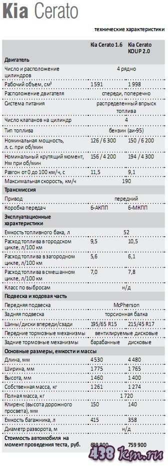 Теперь о ценах. За базовую версию KIA Cerato Koup Comfort с 1,6-литровым 126-сильным мотором и 6-ступенчатой МКПП дилер просит 689 900 рублей. Аналогично укомплектованный седан стоит 619 тысяч. За максимально «упакованное» купе Prestige с 2-литровым мотором (150 л. с.) и 6 АКПП просят 869 900, а за седан — 799 900 рублей. Вполне разумно для современного седана, а что касается купе, то лучшего предложения на нашем рынке сегодня просто нет. Четырехдверный Cerato отлично подойдет на роль единственной машины в семье, причем не обязательно в большом городе. Что касается купе, то этот автомобиль — мечта эгоиста в хорошем понимании этого слова — или эгоистки, потому как вряд ли найдется девушка, которая останется равнодушной к этому авто.