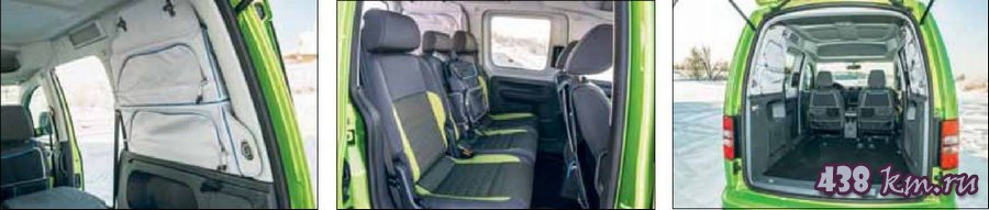 Конечно, мы не можем без придирок, но почему бардачок в подлокотнике такой маленький, глубокий и узкий? В него влезает только телефон, подключенный к USB-входу, а когда внутрь провалилась флешка, я доставал ее пинцетом - рука не пролезает. Но это мелочь, а вот практически вертикальная, как на стуле, посадка задних пассажиров очень диссонирует с водительским и штурманским комфортом. Чувствуется, что разделенный в пропорции 2:1 задний диван в Cross Caddy - элемент пришлый, компромиссный вариант. Сидишь на табуретке, зато коленками никуда не упираешься. Хочешь спинку откинуть - ан нет, багажная полка не дает, да и нет здесь ни «салазок», ни регулировок, зато задний диван вынимается полностью, оставляя пол за передними сиденьями идеально ровным, как будто его и не было. А вот запаски нет вообще, ее принесли в жертву вместительности и проходимости, заменив штатным компрессором и баллоном с герметиком.